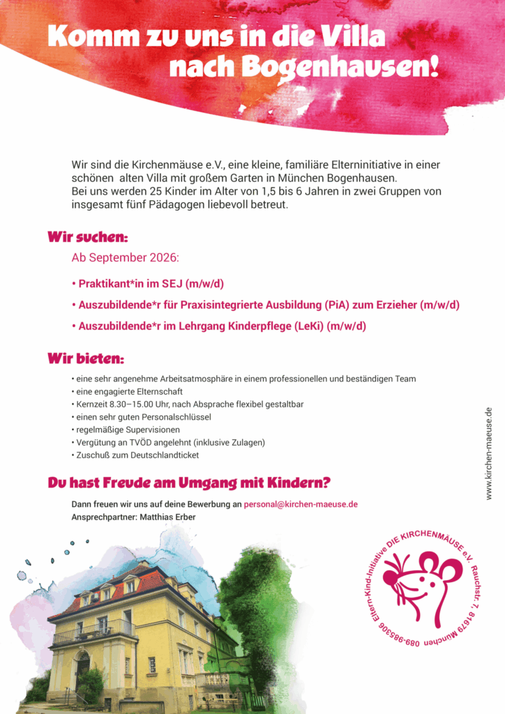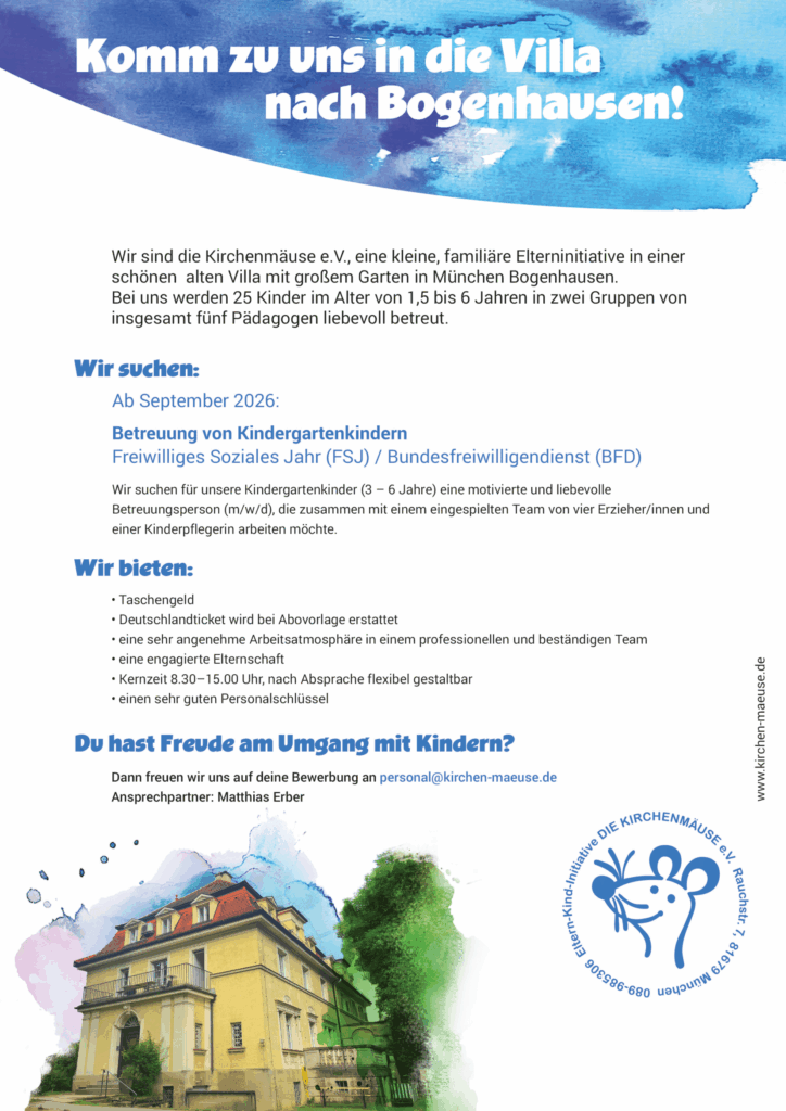 Wir sind die Elterninitiative „Kirchenmäuse e.V.” und betreiben seit 1990 mit viel Freude und Engagement unsere Kinderkrippe mit Kindergarten in München-Bogenhausen.